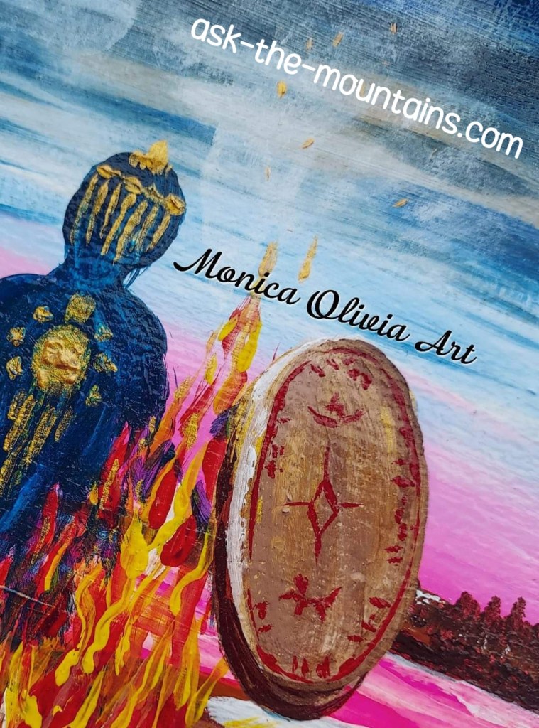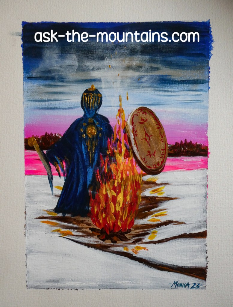 It is from Eastern Siberia that the word shaman comes from, which means to ‘heat up’. Where it originated before that, I do not know. The ‘new shananism’ people in the west speak of today can hardly be compared. Shamanism and animism has permeated most if not all of the nomadic and semi-nomadic cultures in this part of the world. The shamans have traditionally been both women and men, though the word ‘shaman’ is masculine form. The feminine word for a female shaman is ‘udugan’ in Tungusic language. In Northern Sámi a shaman is known as a Noaide. (Acrylic on mixed media paper, A4)Shaman’s drum to aid in the trance travel