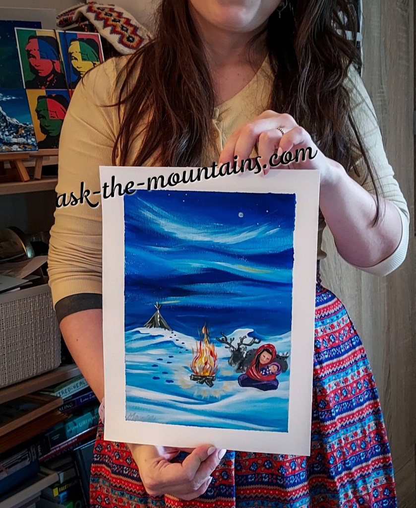 Not a painting or art print, but traditional SΓ‘mi komse (baby carrier). Truly an art piece in itself, with every woven band having a meaning. Art by Emily KewageshigArt by Alanah Jewell