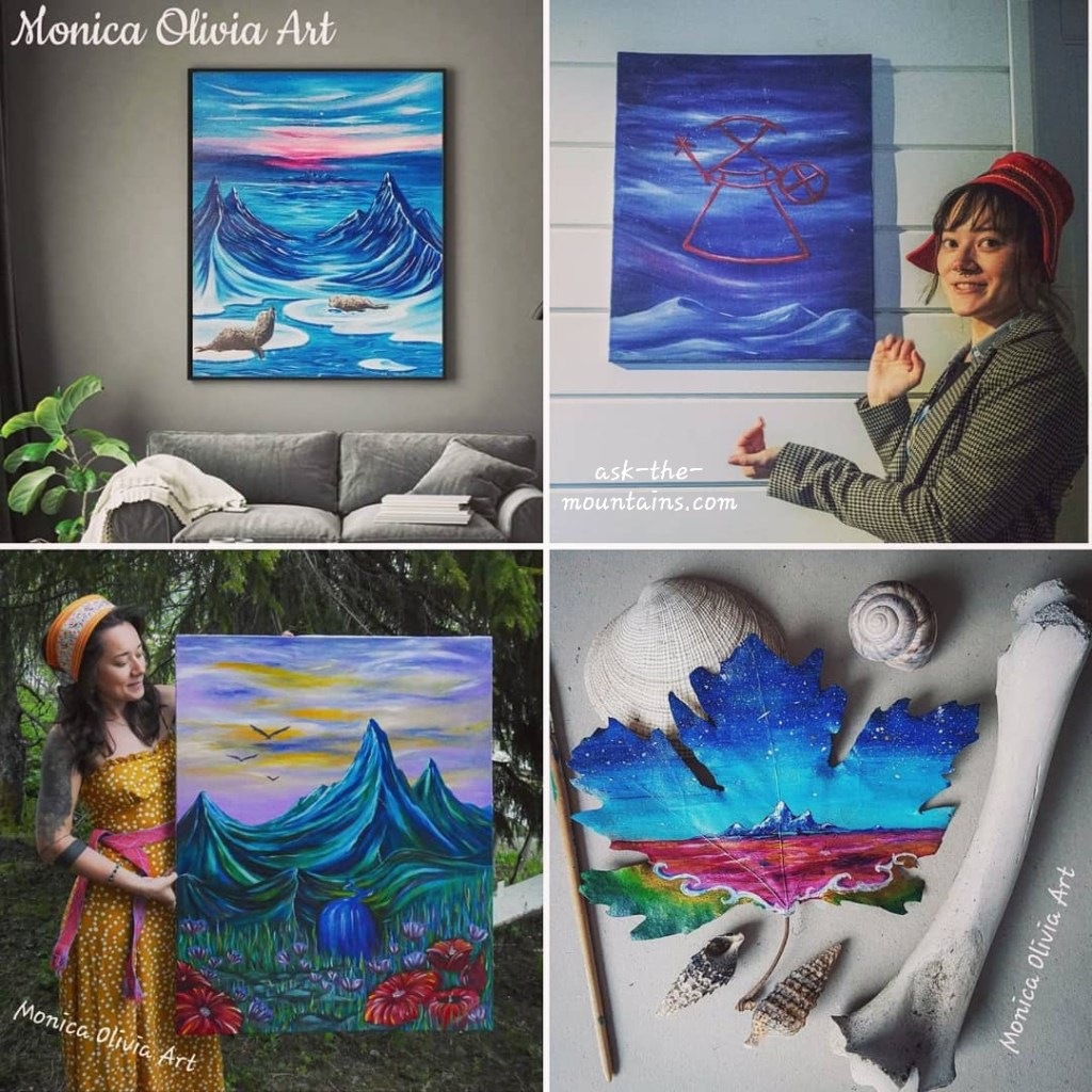 Food and how to get that food is a huge part of any culture. In the Arctic, that food culture has been mainly catching, hunting, fishing and herding, making the foundation of our food for thousands of years an animal based one. We don’t have a lot of local edible plants here, with a few exceptions like berries for example. With the influx of trading and new borders, new foods were introduced, but if you are like me, I don’t tolerate them well at all, especially grains, and a lot of carbs . So I stick to an ancestral Arctic diet that my stomach and body loves, and I feel extremely passionately about food culture, so I guess that is what I made this painting about. I also added 3 samoyed sled/herding dogs, as a little head nod to another Uralic Arctic people neighbouring Sápmi; the Nenets. (An obsolete name for them used to be the Samoyed people, a name not used by themselves). Acrylic on 80 x 80 cm canvas, details in silver and gold pen, oil pastel crayons. 🩷🩵💜🤍💚