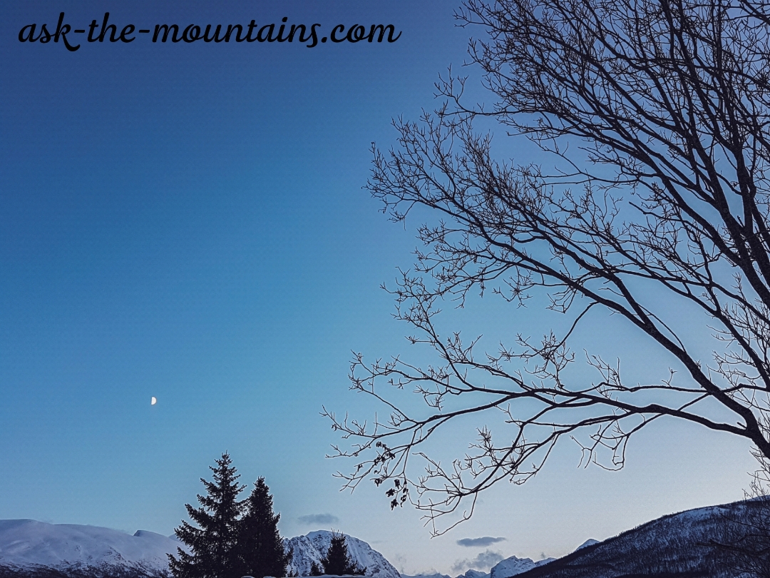 “No sløkkes en dag som så vidt rakk å gråne og vise fram landet ei skjømmingsblå stund og gjømt attom fjellan i aust står en måne som snart skal strø sølv over fjorda og sund. I sør ligg ei strime av lys over tindan der dagen blør ut før han slokne førr godt og vi står igjen med oss sjøl og med minnan i mørketidslyset der allting blir blått.