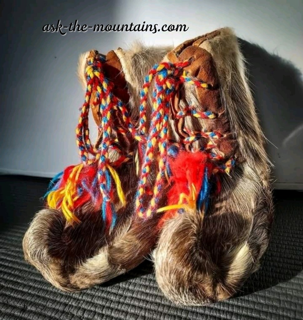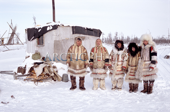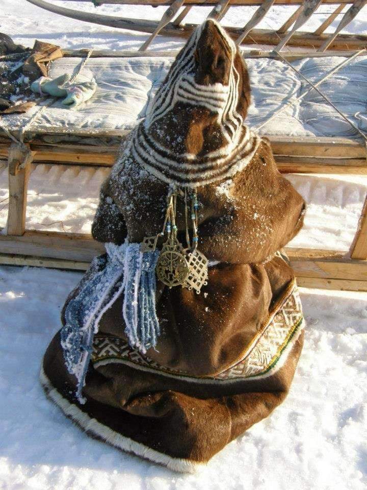 Sámi man in gákti with reindeer pants and mittens. The shoes are nuvttohat, skaller, nutukas.. many names for same shoe. Different languages and dialects. Photo by Lola A. AkerströmKautokeino Sámis. Guovdageaidnu in Northern Sámi language. Wearing pesks and gáktis. With traditional shawls, belts, mittens and hats. Northern Lapland/Sápmi. Khanty woman Kristina Neva and baby in reindeer clothing with decor. Summer on the Arctic tundra. Photo by Bryan and Cherry Alexander.