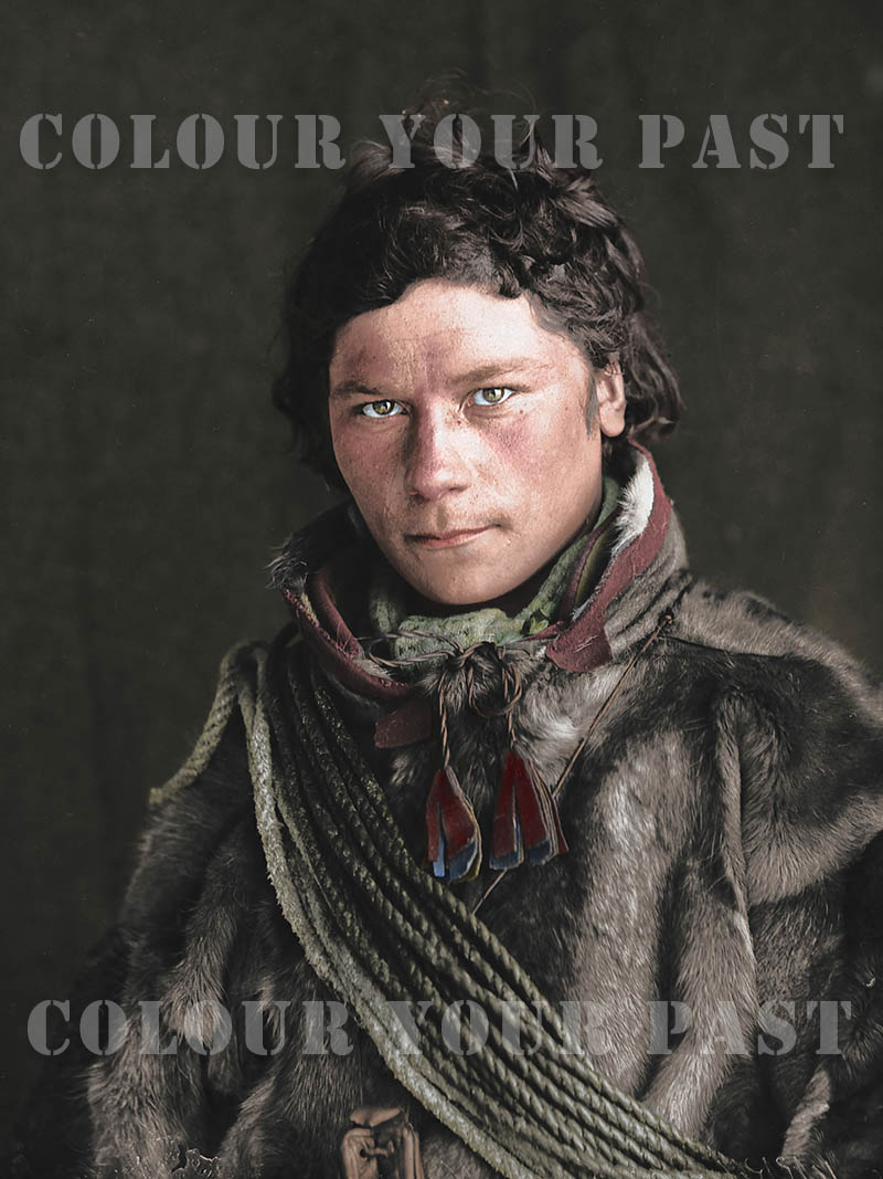 Photo coloured by Per Ivar Somby. In the photo: Brita Somby, wearing traditional dress (gákti) with traditional wool shawl. Reindeer pants and boots.