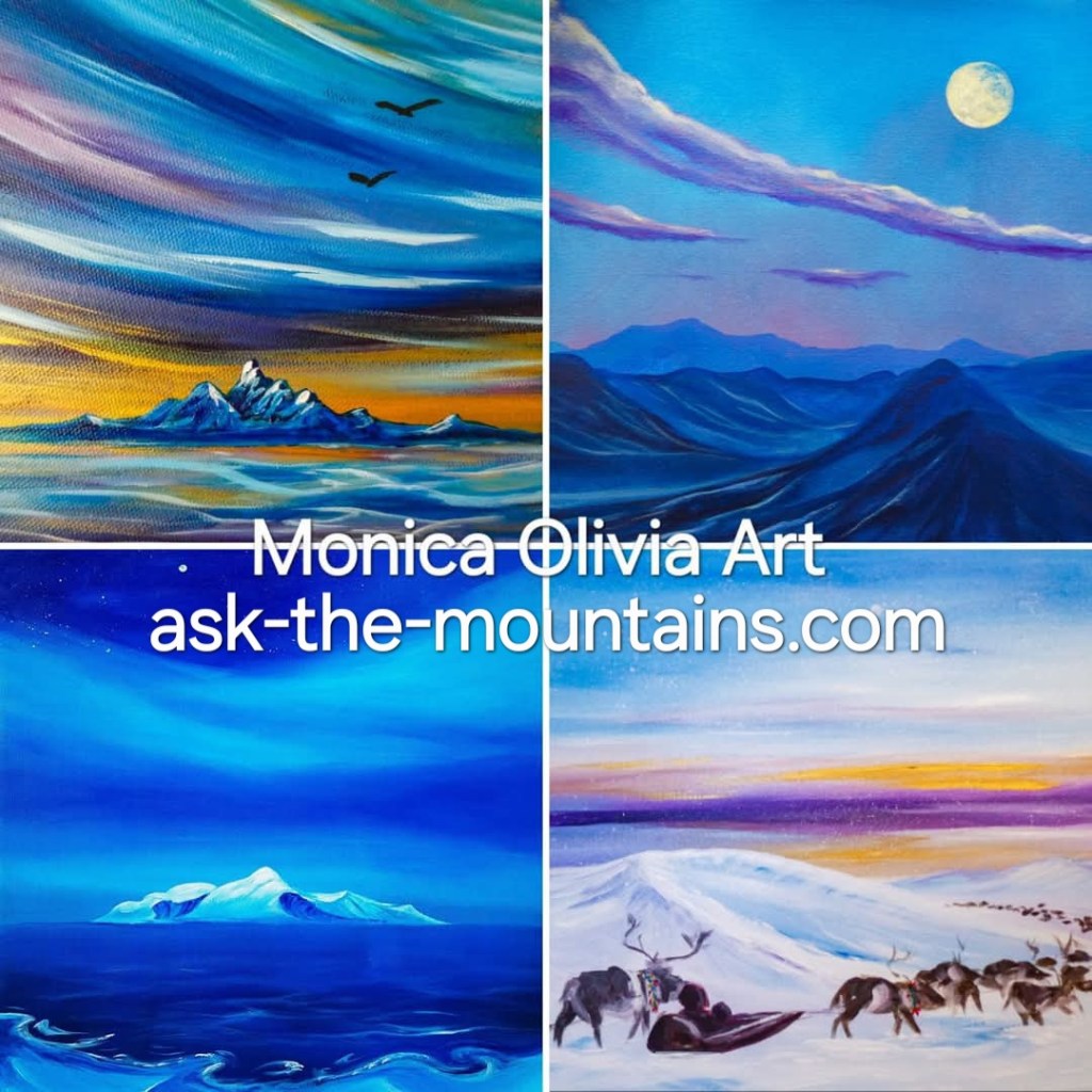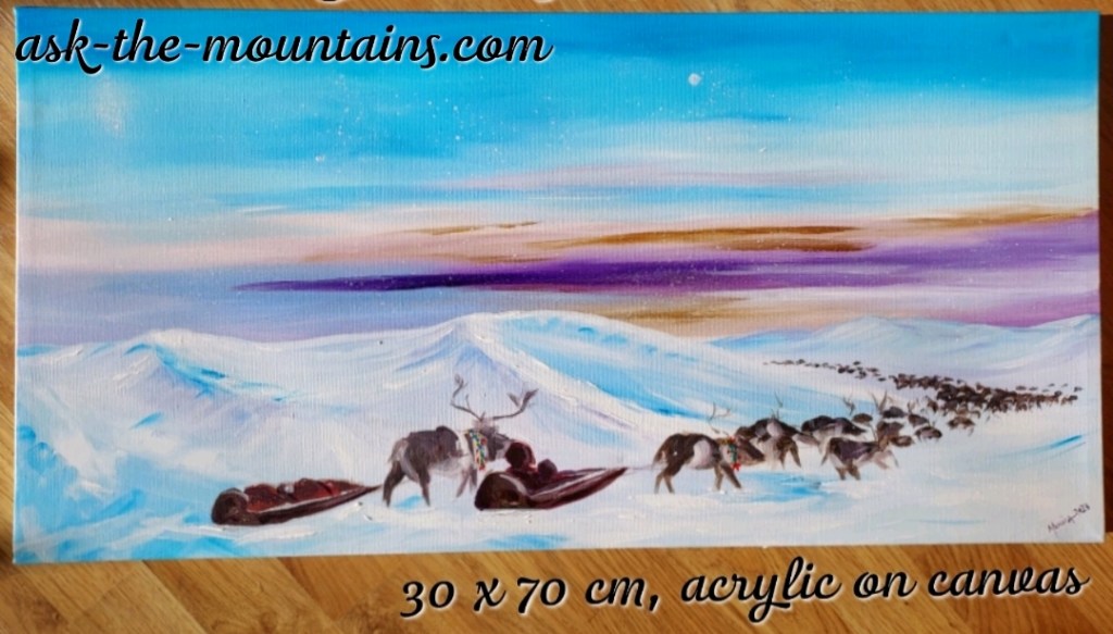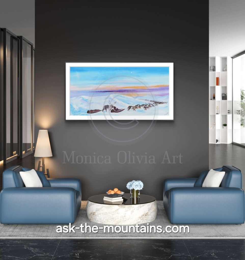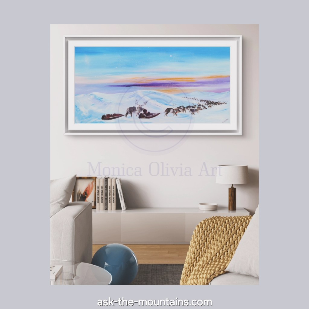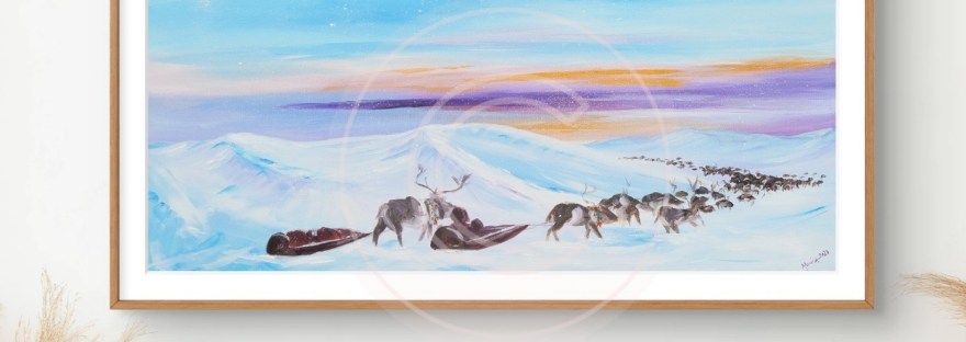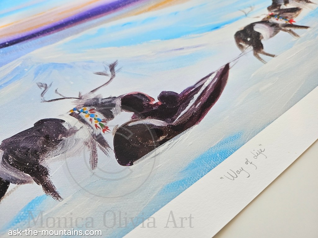 This is the landscape nomadic peoples of the Arctic have travelled for decades and generations. Moving their herds and homes and children safely tucked onto sleds, across the tundra. This is still the case in some areas. If you’ve witnessed the ever-changing play of colours and atmosphere during the Arctic winter and Polar night, it looks something like this; pastel skies, crisp clear air, moon in daytime and the sun hiding behind the horizon, blessing us with a few rays here and there before leaving for a few months. I am in awe at how my ancestors have survived and even thrived here for so long; I feel moved to my core by their know-how of the elements, seasons and animals. “Way of Life” art print, 2400 NOK 🩵💜🤍🧡 89 x 46,5 cm including white edges. The prints have the title written on the white part in front, and signature on the back.