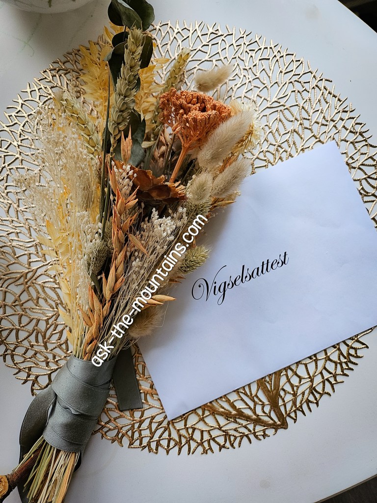 Gold wedding ring inscribed with my now husbands dharma name inside, and he has mine. Never owned anything made from gold before 😄 Always wanted an inscribed gold ring ever since I saw LOTR as a child😜 My bouquet was something I put together from dried flowers and the band around it was same colour as my wedding dress; actually I cut the band (belt) from the dress itself because it was too long.