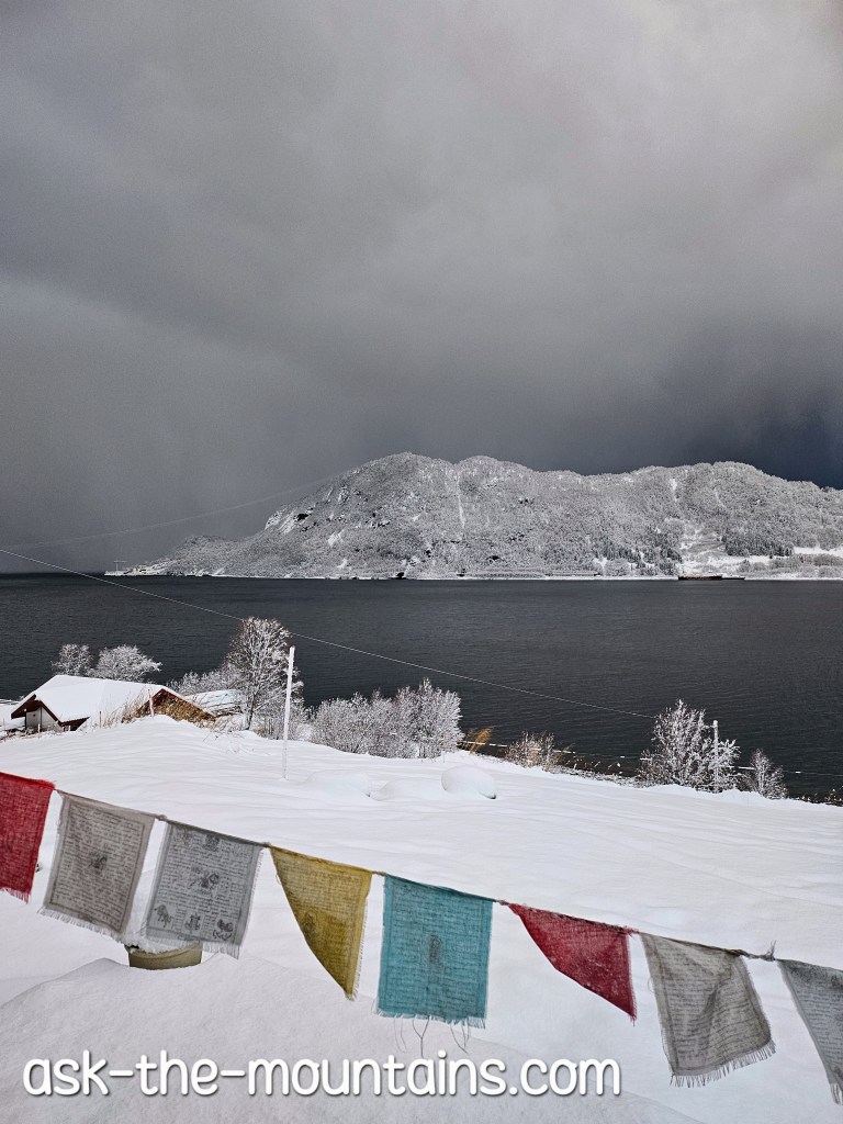 October photos. Colourful sky, sunny days and snowy days.. It’s always shifting very fast here, you could almost say there is four seasons within one season 🌅🌦❄️Prayer flags in our garden ☃️ The weather was interesting that day; grey sky and sea, white landscape and a heavy kind of silence.